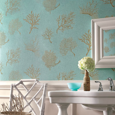 Aqua blue bathroom with coral wallpaper Spa style bathroom ideas housetohome.co.uk